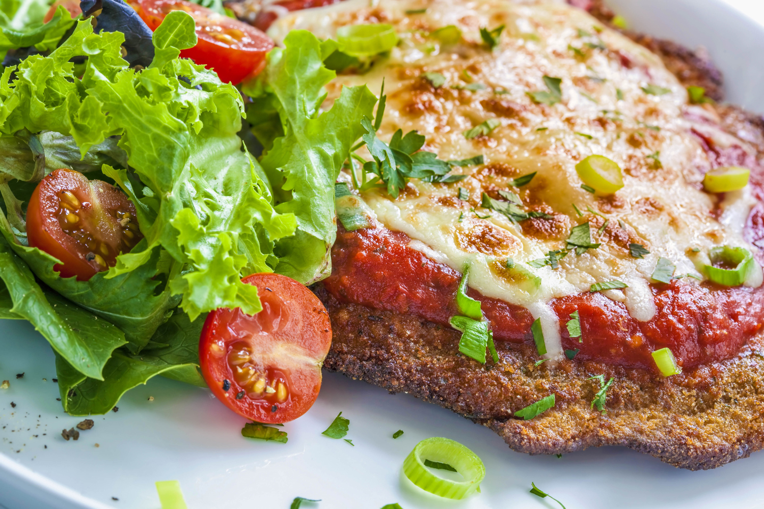 Baked Eggplant Parmesan Ingredients: 2 large eggplants 1 cup flour 3 eggs 1 ½ cups Italian breadcrumbs 2 tsp. garlic powder 1 1/2 cups marinara 1 lb. mozzarella cheese, sliced 1/3 cup shredded parmesan cheese 2 Tbsp. fresh basil 2 Tbsp. Italian seasoning Directions: Remove stem from eggplants then slice into 1/4-1/2 inch thick slices.