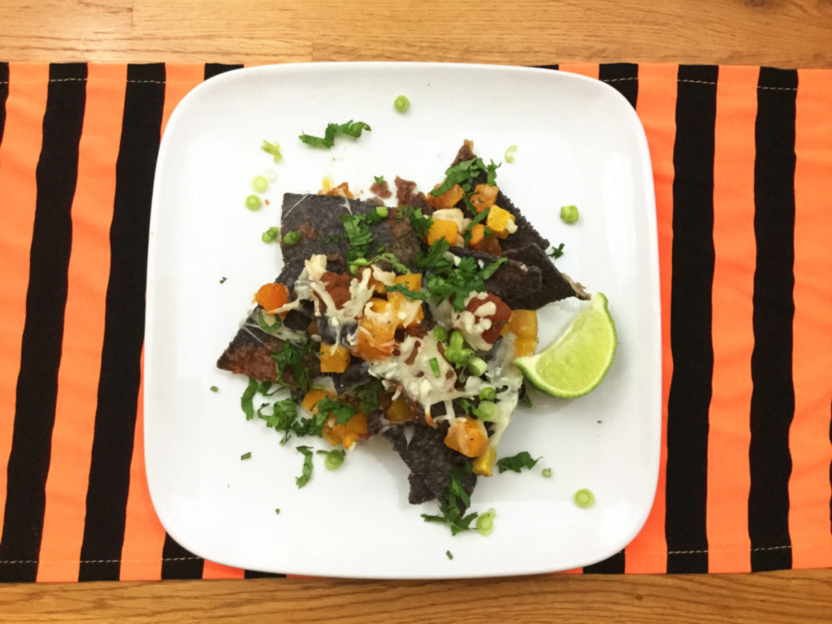 Ingredients: 4 cups fresh squash or pumpkin, cubed 2 Tbsp. olive oil 1/4 tsp. black pepper 1 13-oz. package blue corn tortilla chips, baked 1 15-oz. can low sodium black beans, drained 2 cups low fat mozzarella cheese Optional toppings: fresh cilantro, diced green onion, diced guacamole fresh lime juice Directions: Preheat oven to 400