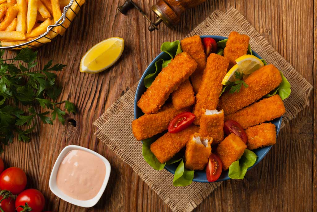 Fish Sticks with Tartar Sauce Fish Sticks Ingredients: 1 lb. boneless, skinless cod (or other lean white fish, such as halibut or tilapia), cut into 3×1 inch strips 1/2 cup whole-wheat bread crumbs 1/4 cup unsalted, unoiled almonds 1/4 tsp. garlic powder 1/8 tsp. cayenne pepper 1/4 cup all-purpose, whole-wheat flour 1/4 tsp. black pepper