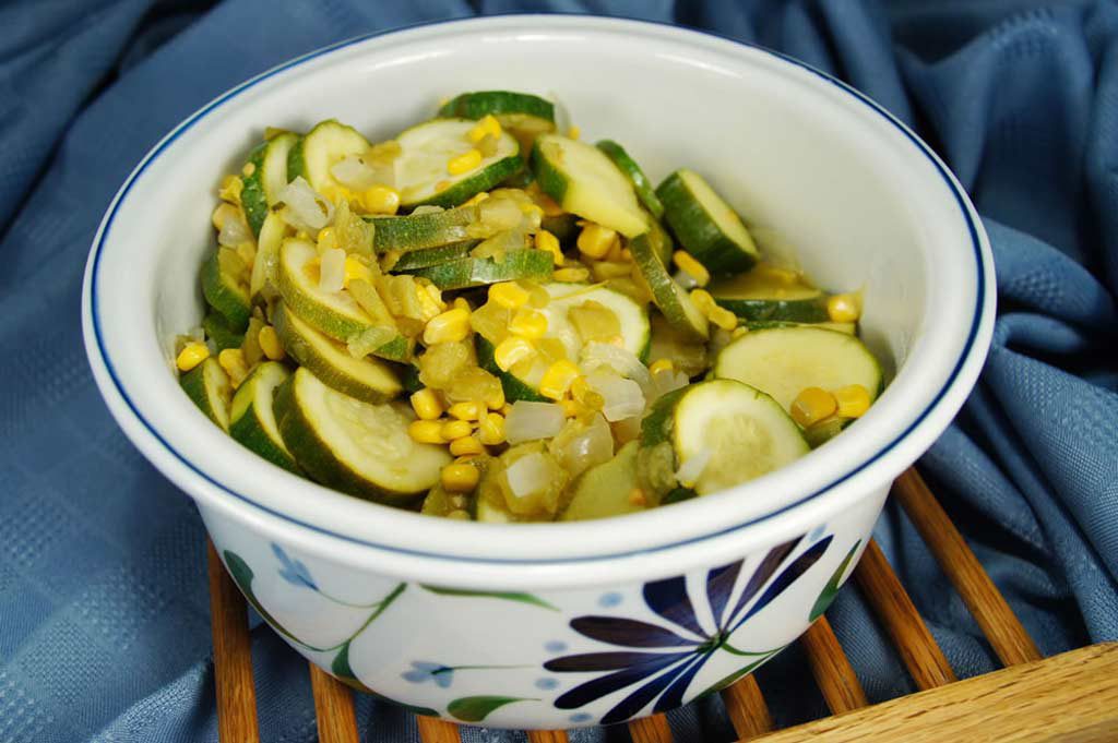 Ingredients: 1 cup frozen corn (or canned, drained) 2 cups diced green chilies (roasted and peeled, fresh or frozen) 4 medium zucchini, sliced 1 cup chopped onion 2 small cloves garlic, minced (or 1/2 teaspoon garlic powder) 1/2 teaspoon salt 1/2 teaspoon pepper Directions: Combine all ingredients in a large frying or medium saucepan. Cook