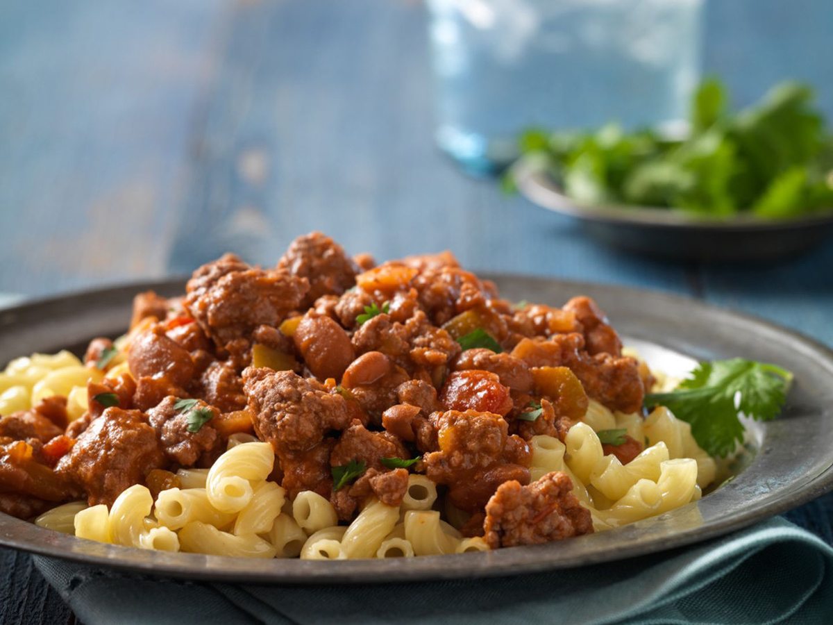 Ingredients: 1 pound Ground Beef 1 can (15 to 16 ounces) chili beans in chili sauce 1-1/2 cups prepared thick-and-chunky salsa 1/2 cup water 1/2 cup chopped fresh cilantro Hot cooked elbow macaroni Directions: Heat large nonstick skillet over medium heat until hot. Add Ground Beef; cook 8 to 10 minutes, breaking up into 3/4-inch
