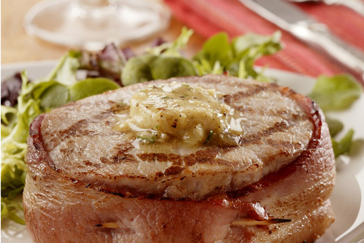 Ingredients: 4 6-7-ounce New York (top loin) pork chops 1 1/4-inch thick 4 slices bacon thick-cut 1/4 cup butter (1/2 stick), softened to room temperature 2 teaspoons Dijon mustard 1 clove garlic minced Directions: In a small bowl, stir together ingredients until well mixed. Wrap in waxed paper to shape like a stick of butter.