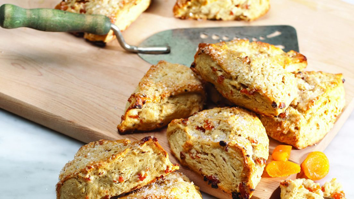 Imagine waking up on a chilly morning and beginning the day with a tender scone and a cup of tea. Not too sweet, this scone is studded with apricots and is even better slathered with some berry jam or lightly whipped cream. Yield: Makes 8 scones Ingredients: 2 cups all-purpose flour 1/4 cup light brown
