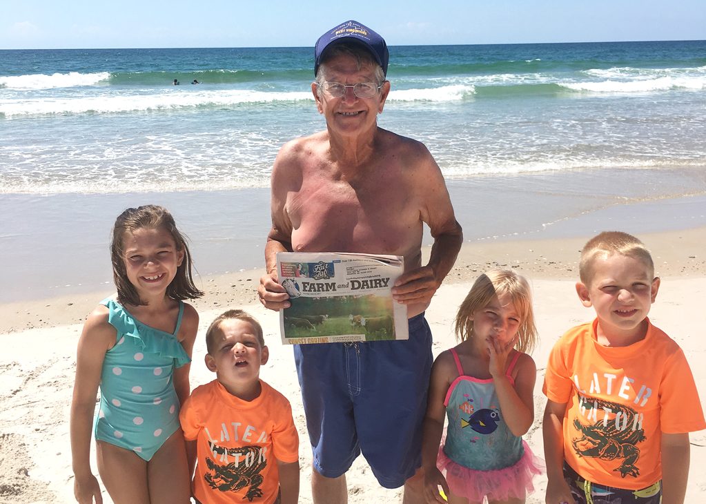 Stephen Cozart, a beef farmer from Suffield, Ohio, and long-time subscriber to the Farm and Dairy, took the paper to the beach on Topsail Island, North Carolina. He is pictured with his four grandchildren, Eliza, Jacob, Julianna and Allen.