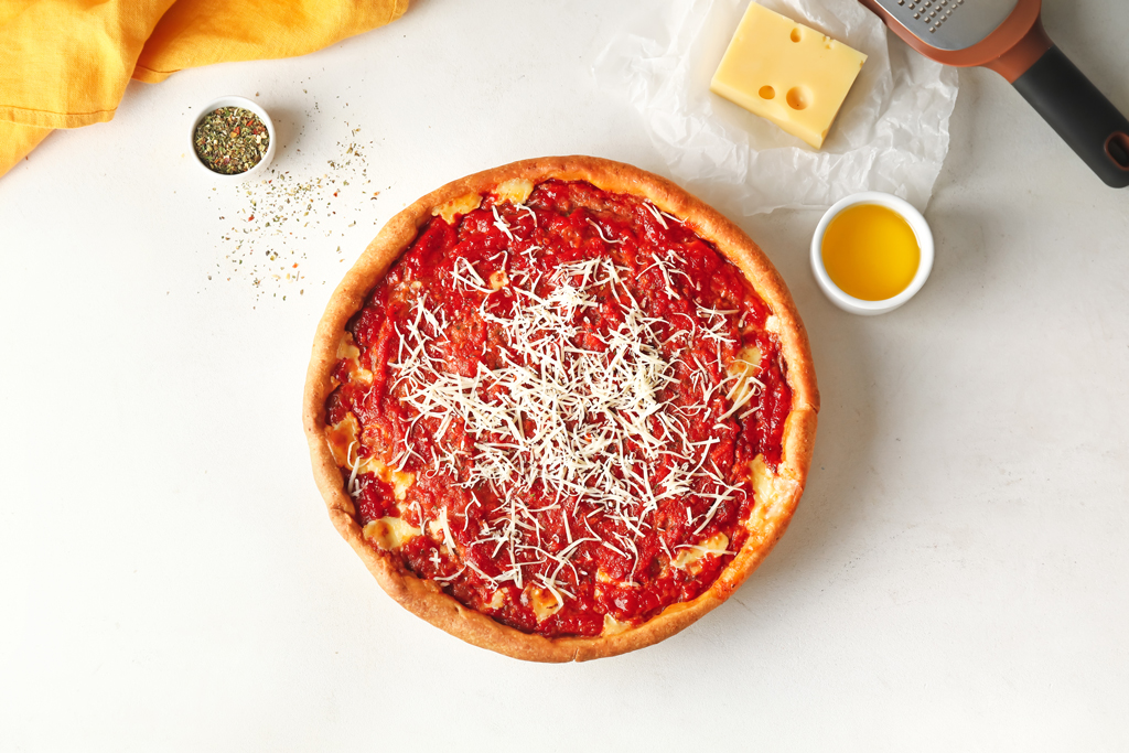 Hot Sausage Deep-Dish Pizza Ingredients: 3 tablespoons butter, cubed 2 medium onions, thinly sliced 1/2 pound bulk hot Italian sausage 1 pound (16 ounces) fresh or frozen pizza dough, thawed 1/3 cup pizza sauce 1 1/4 cups Fontina or provolone cheese, shredded 1/3 cup julienned roasted red peppers, drained 6 ounces part-skim Mozzarella cheese, shredded