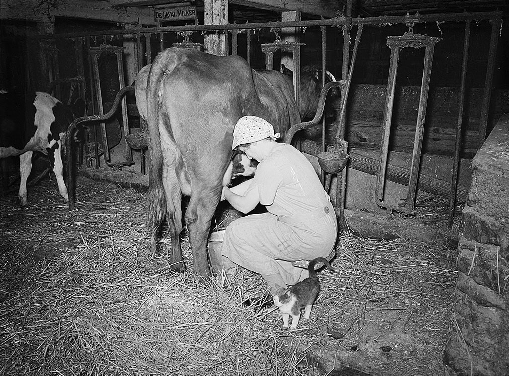 Woman milking a cow at a Lancaster dairy in 1938