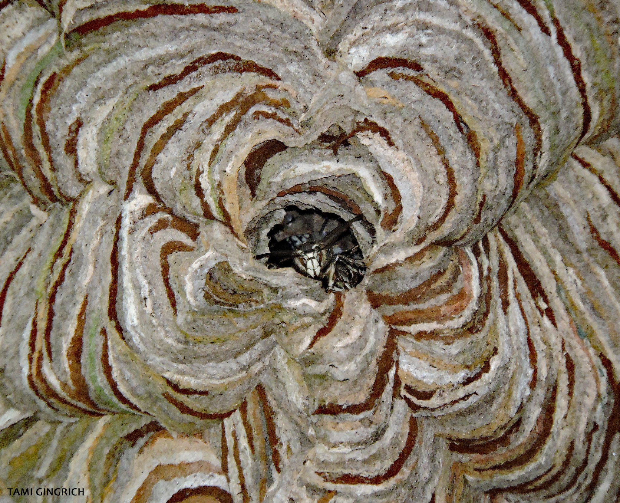 Each type of wood fiber collected and chewed results in a different color creating incredibly beautiful patterns. As the layers of horizontal combs containing larvae grow within, so do the surrounding walls of the hive. Thus, a structure that may have been too small to notice early in the summer, becomes much more visible as the hive increases in size.
