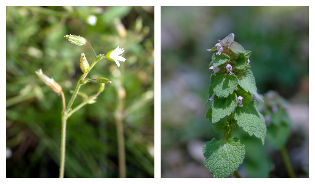 Purple deadnettle (at left) is one of the winter annual weeds that can present a problem in your alfalfa stands, and common chickweed (photo at right) infestations in alfalfa hav ebeen reported to reduce forage stands by more than 30 percent. (Photos: Chris Evans, University of Illinois, Bugwood.org./Mary Ellen (Mel) Harte, Bugwood.org.)