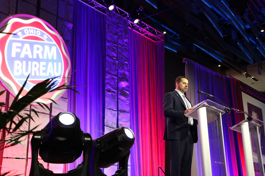 Ohio Gov. Mike DeWine speaking at the the Ohio Farm Bureau Federation’s annual meeting, Dec. 4, in Columbus. (Ohio Farm Bureau photo)
