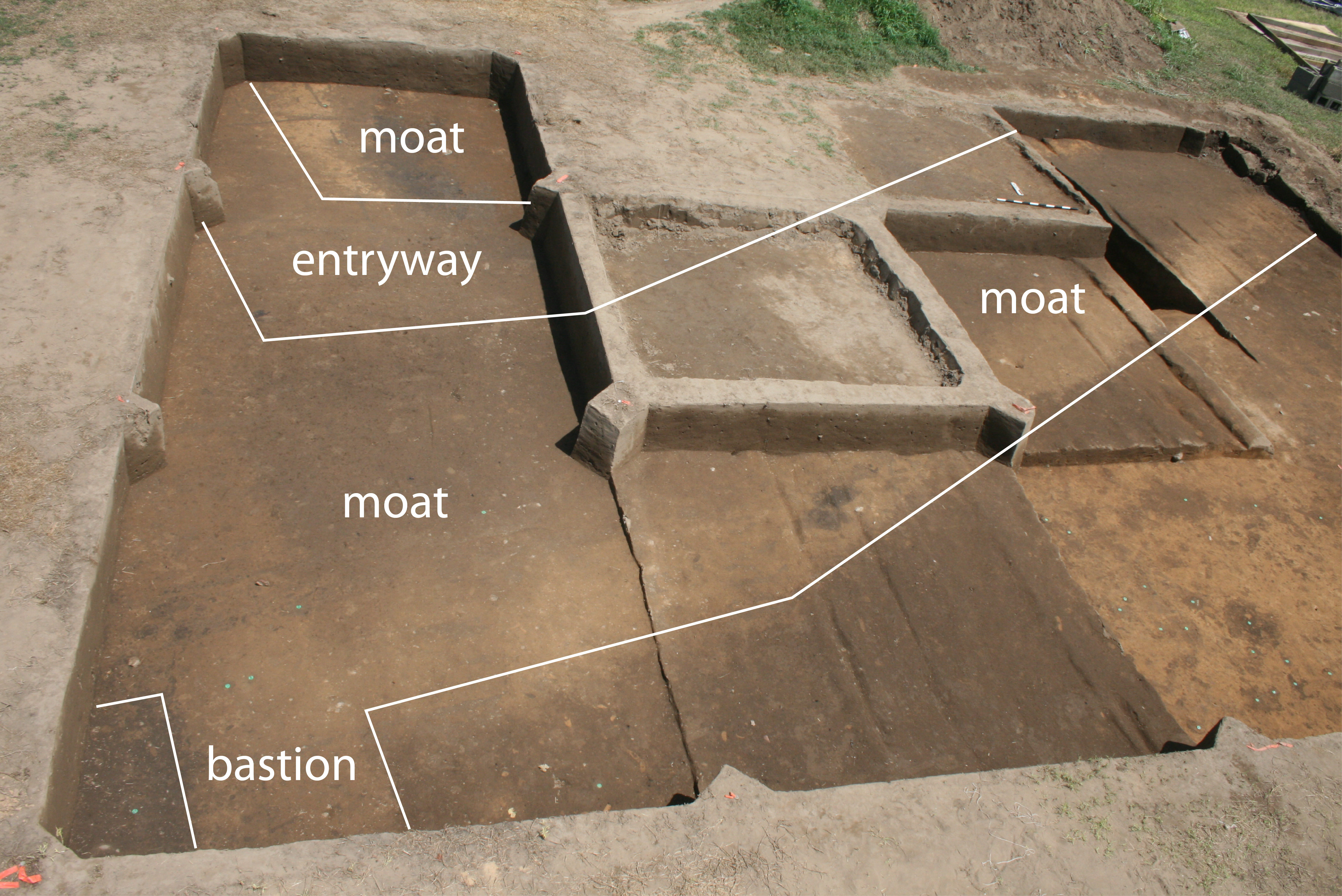 Excavations in the moat conducted in late June reveal it to have been a large V-shaped feature measuring 5.5 feet deep and 15 feet across.