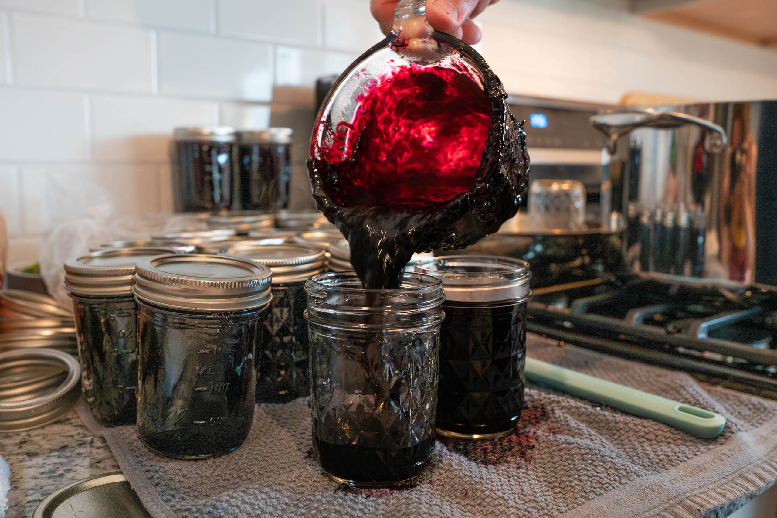 Step 6: Canning. Quickly pour or ladle the jam mixture into the pre-warmed half-pint jars. You will want to do this fast as the jam mixture will begin to solidify. Once all jars are filled, put the lids on, screw on the cap and place them into the prepared water bath for 10 minutes.