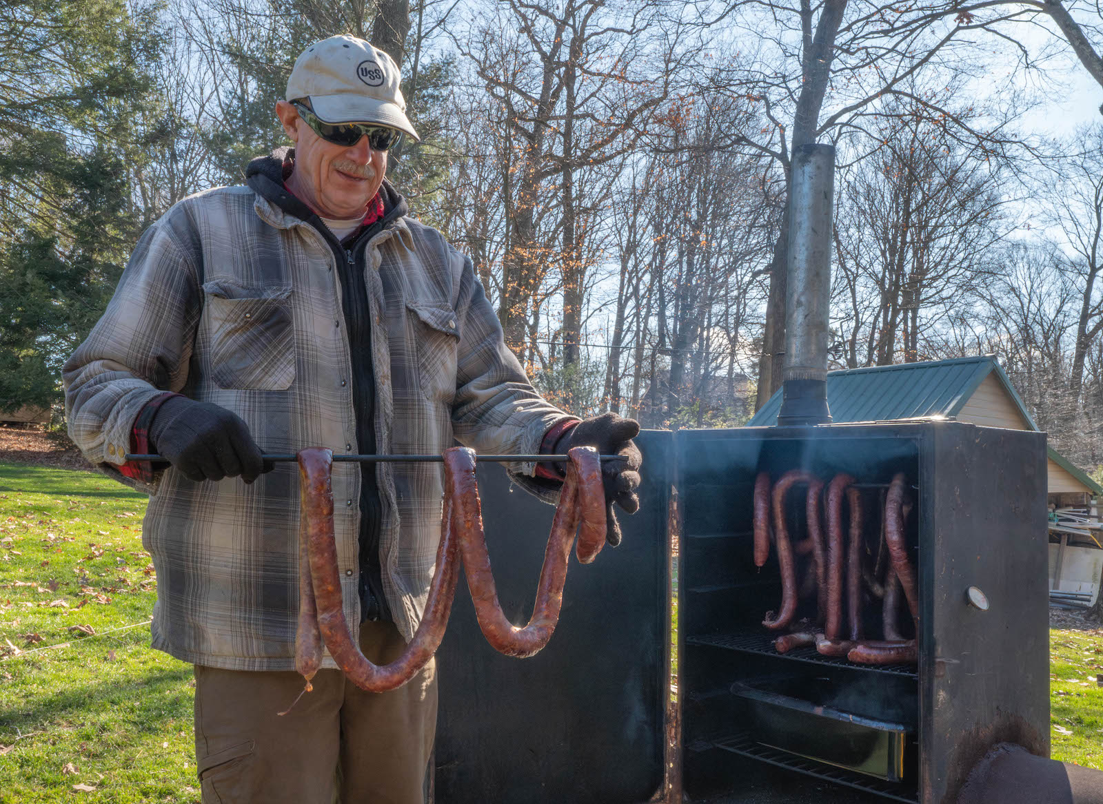 Terry created the smoker by welding together a toolbox and oil drum. To smoke the deer kielbasa, he hangs the filled casings on rods that slide into the toolbox. He then puts a bin with water in it below the links. The water helps “cook” the kielbasa similar to the way you steam broccoli. Once all links are loaded, he shuts the door and puts wood in the oil drum.