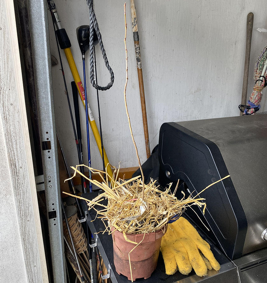 I couldn’t overwinter my tree using the first method because the ground was already frozen when I received it. Instead, I prepared it to be overwintered in an unheated garage.
