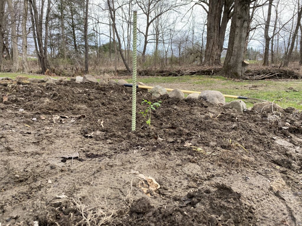 I picked a blueberry bush because I know that there are a few native varieties of blueberries the grow in northeast Ohio, which means the natural conditions in my backyard are already close to ideal for growing blueberries. Additionally, planting native plants helps pollinators and other wildlife.