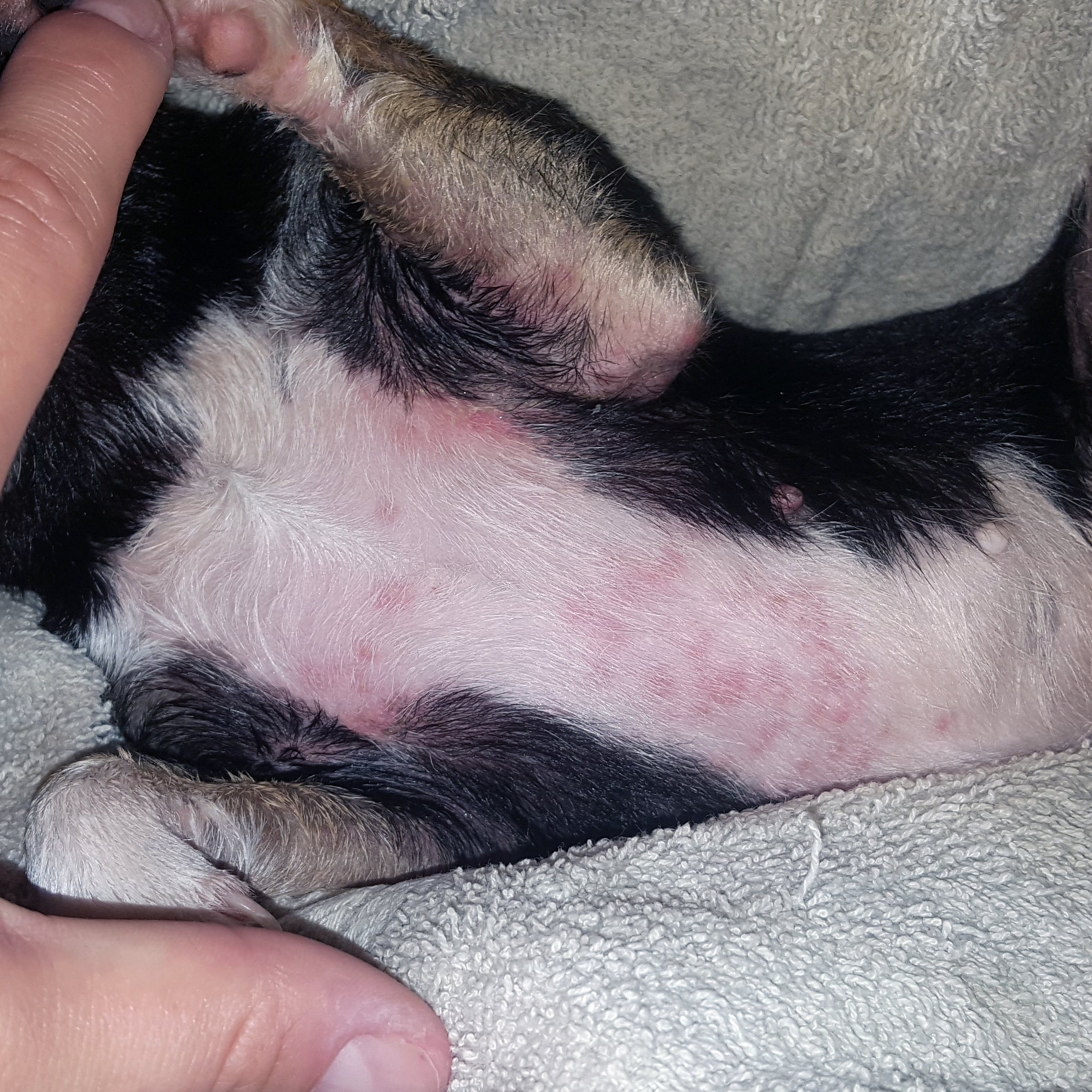 The rash will most likely appear on your dogs stomach or other areas of your dogs body that don’t have much hair. However, that’s not to say your dog can’t get a rash on an area that’s covered by hair. Nuttie’s chest is only covered by a thin layer of hair and the exposure was enough to cause a reaction.
