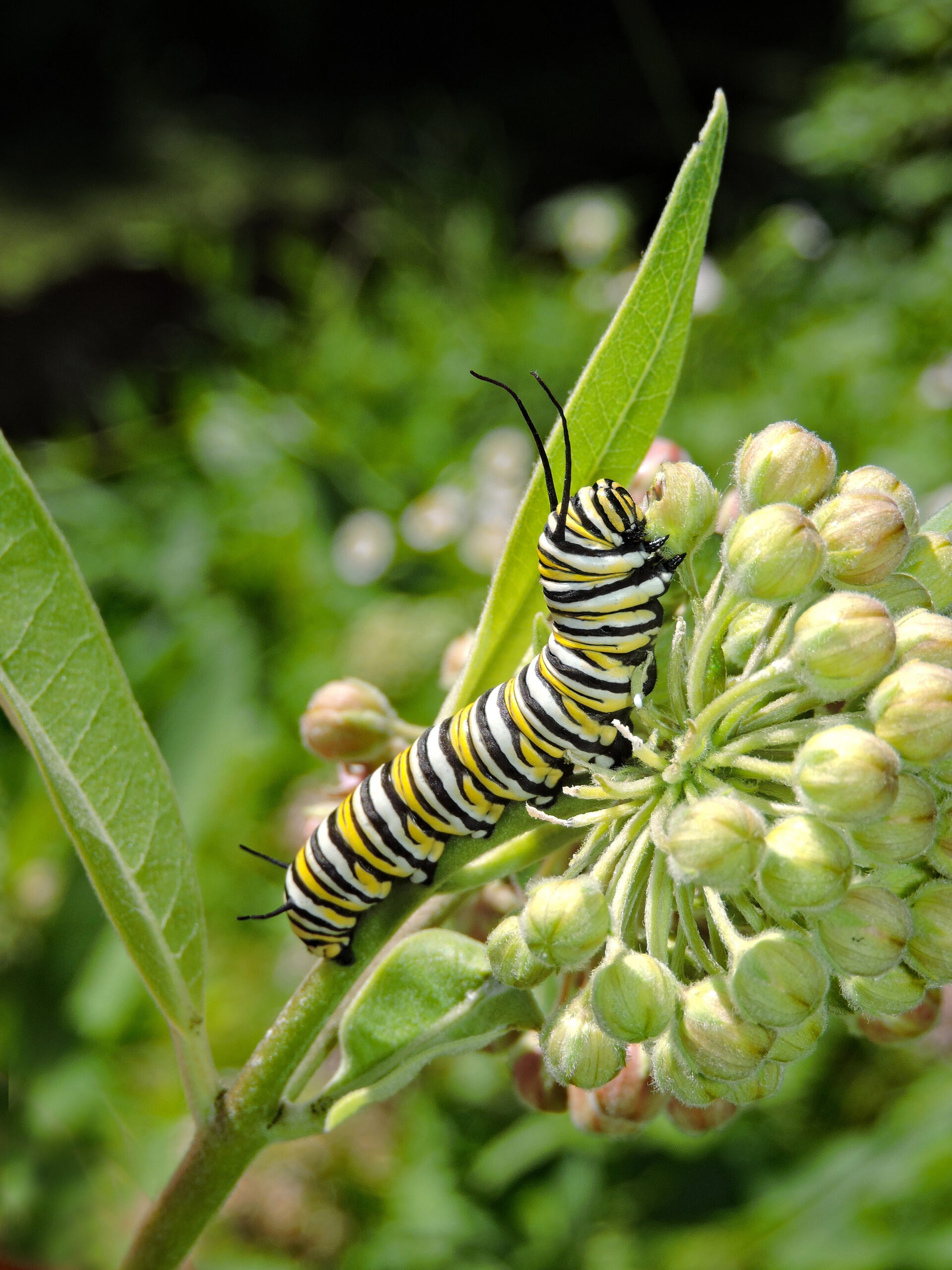 Milkweed gets its name from the milky latex that drips freely from the stems or the leaves if the plant is picked or damaged. This sap contains copious quantities of cardiac glycosides that are toxic to large animals. Livestock, however, seem to naturally sense this and avoid them in their pastures. Interestingly, as the monarch caterpillars consume the milkweed leaves, these compounds build up in their bodies, making them toxic and bitter throughout every stage of their lives. A predator only needs to eat a monarch caterpillar or butterfly once to learn a valuable lesson in its future cuisine.