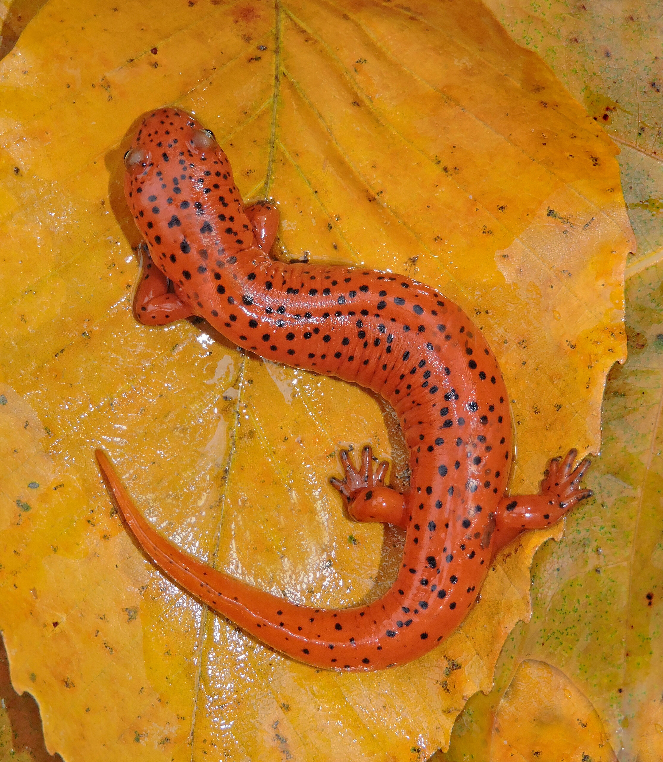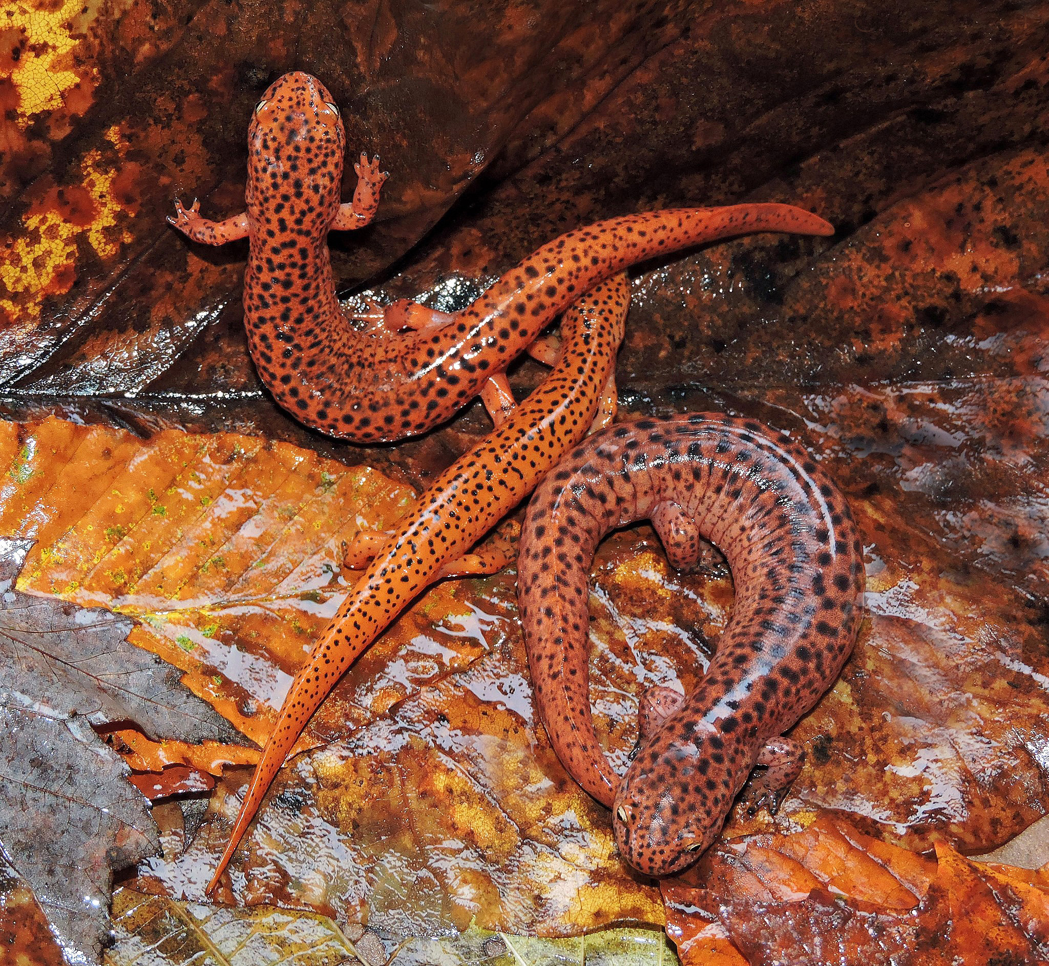 A few years ago, I was treated to an unexpected spectacle. On a warm, rainy afternoon in October, I was strolling along a woodland trail when a movement caught my eye. A beautiful northern red salamander (Pseudotriton ruber) was making its way across the forest floor. “Score,” I thought, bending down to examine the beautiful specimen and take some photos against the colorful leaves. Suddenly, another motion caught my eye, as a second red salamander ambled by. I snatched it up, adding it to the first one for a photo of the duo. Crazy as it seems, a few minutes later, I actually heard another, a big individual, moving with much determination through the leaves. The trio formed a perfect example of how the amphibians sport different colorations at different ages. While my little photo session was in progress, I observed many other red salamanders marching along, all headed in the same direction. Unlike spotted salamanders and Jefferson salamanders which are known for their extraordinary migrations into vernal pools in early spring, red salamanders are not known to exhibit mass movements, but this was the closest thing I’d ever seen.