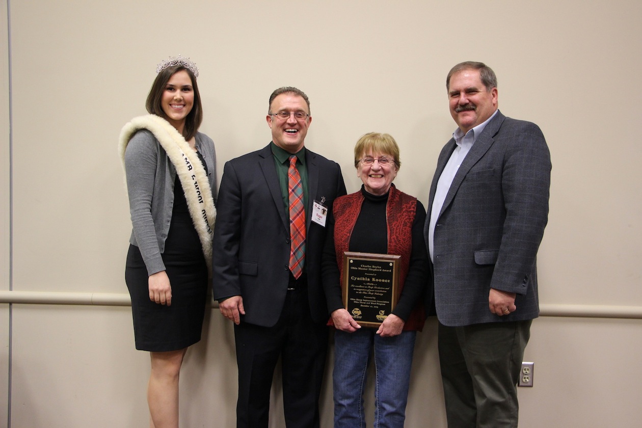 Cynthia Koonce, of Columbiana County, received the Charles Boyles Ohio Master Shepherd Award at the Buckeye Shepherd’s Symposium Dec. 12 for her contributions to the sheep industry and her dedication to her own flock. She was joined by Ohio Lamb and Wool Queen Abby Pozderack, Ohio Sheep Improvement Association Executive Director Roger High and OSIA President Shawn Ray. (Catie Noyes photos)