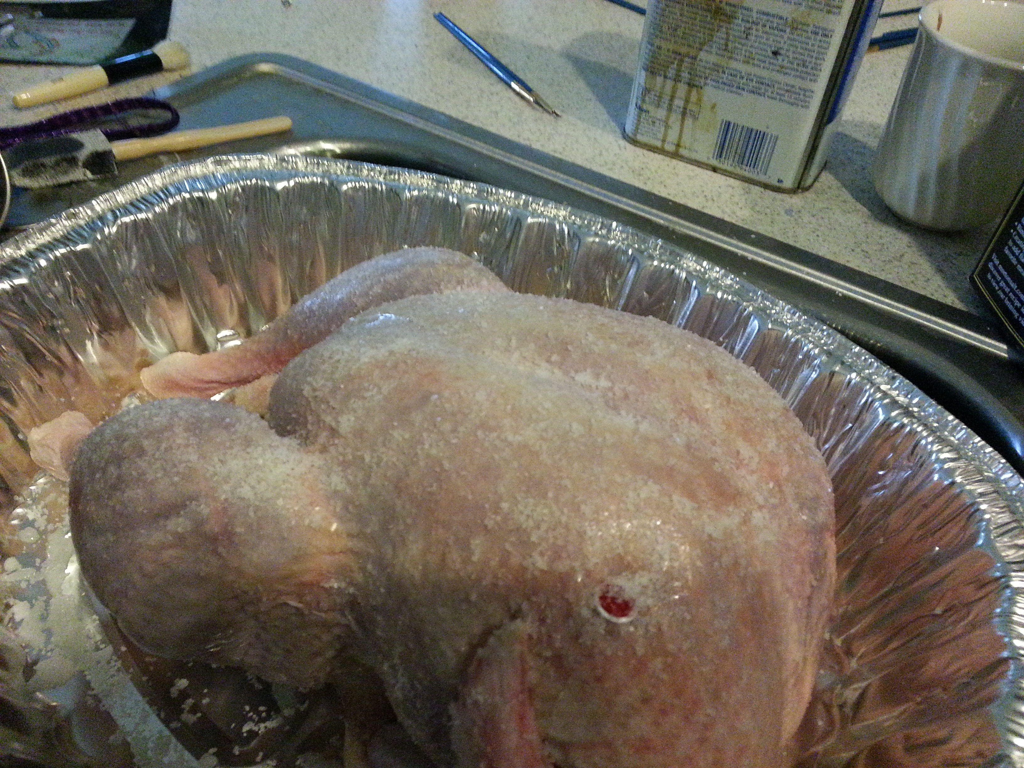 3. Take a liberal amount of kosher salt and rub all surfaces of the turkey. Also rub the salt on the inside of the turkey.