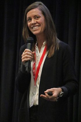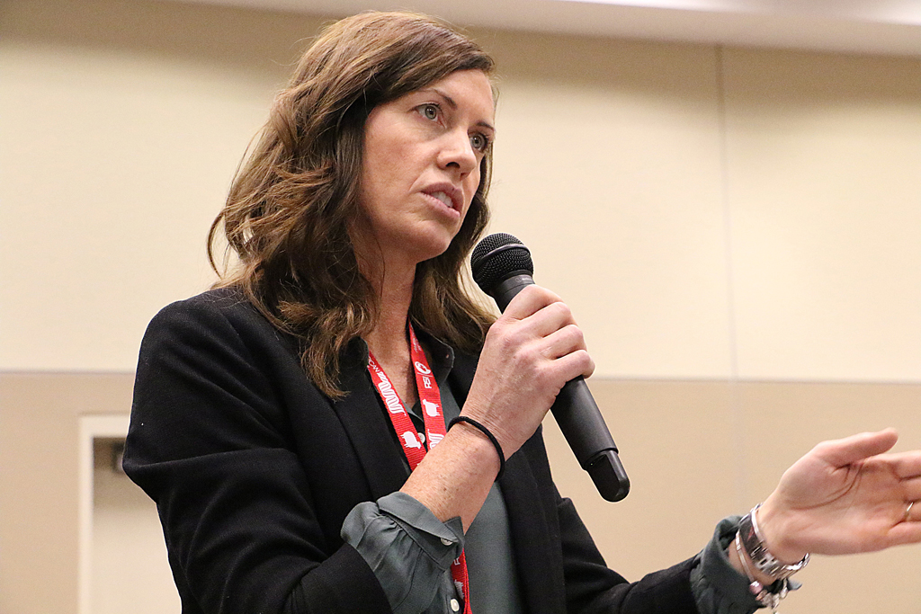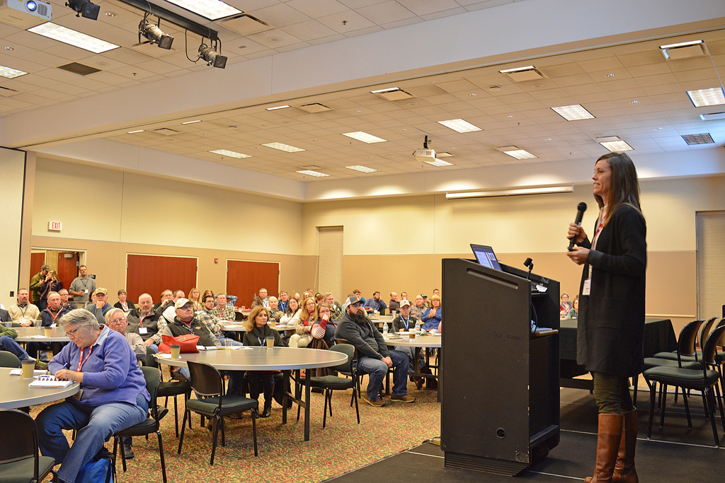 Sandi Brock, Canadian sheep farmer and rising social media personality, shared about how she manages her housed, accelerated flock, at the Buckeye Shepherds’ Symposium, Dec. 14, in Wooster, Ohio. (Rebecca Miller photo)
