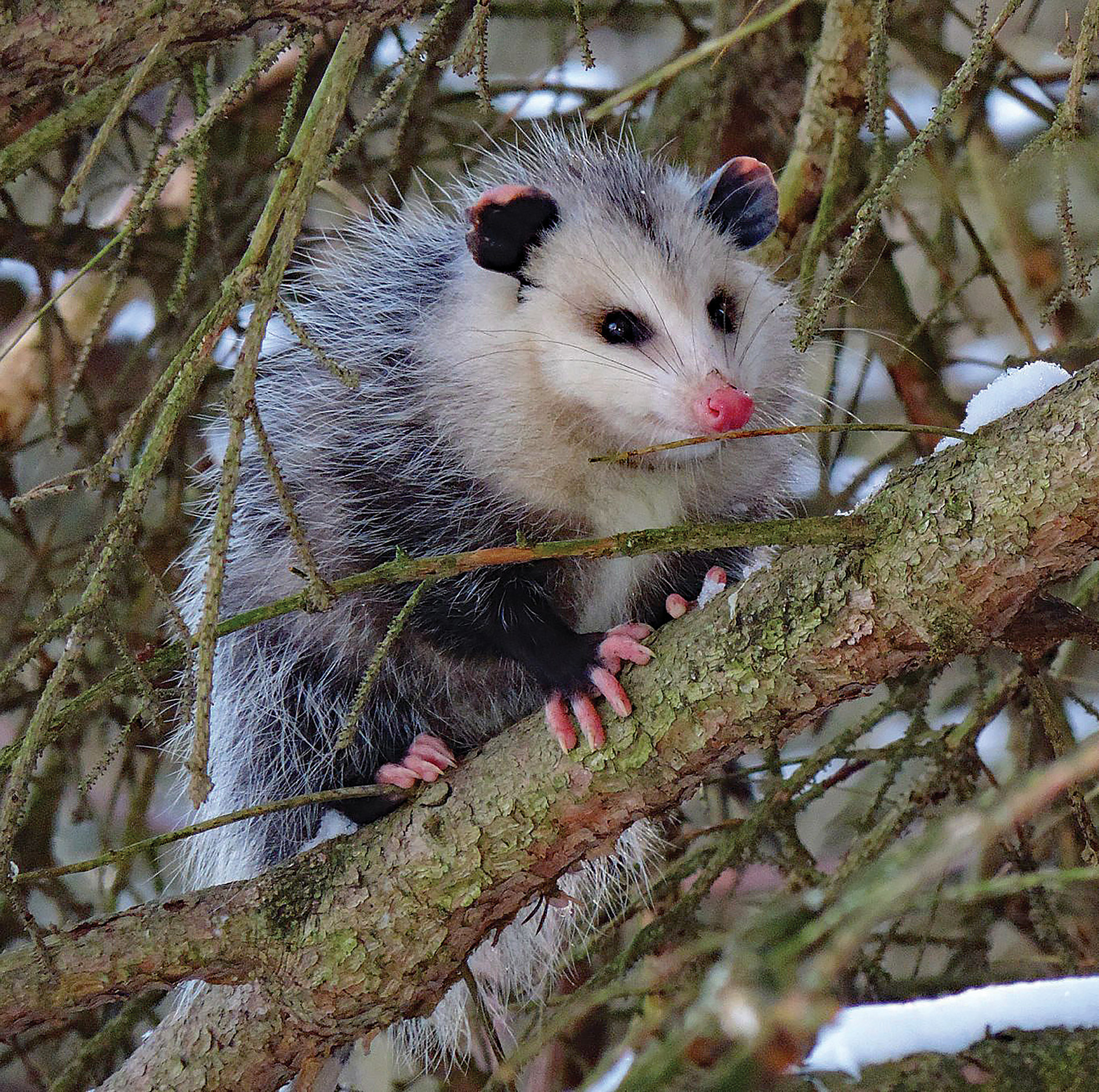 Visually, the opossum is unique with its beady eyes, rosy nose and pink toes. Its ears and toes are hairless, making them susceptible to frostbite, as they are active year-round. The five toes on each front foot resemble a little hand, while each back foot sports an opposable thumb. This digit, without a nail, can swivel around independently to help it grip and climb. This unique arrangement of toes gives the opossum unusual, telltale prints in the snow.