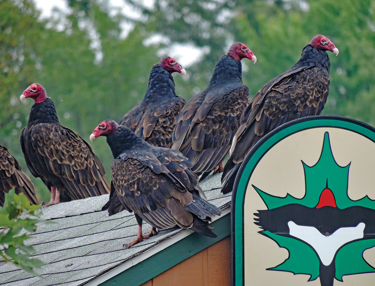Without a doubt, turkey vultures are one of the most misunderstood, underappreciated members of the bird world. Standing nearly 3 feet tall with a wingspan of 6 feet, they are impressive to behold. They get their name from their featherless, red head that resembles that of a wild turkey, but that is where the similarities end. Overall, a turkey vulture is black in appearance with brownish tones highlighting the edges of its feathers. Its ivory-colored beak is sharp for tearing meat, yet its large feet lack the powerful talons associated with other birds of prey. Vocalizations are limited to a variety of hisses and puffs used in communication. Turkey vultures should not be confused with black vultures, a much different, smaller species with a more southern range.