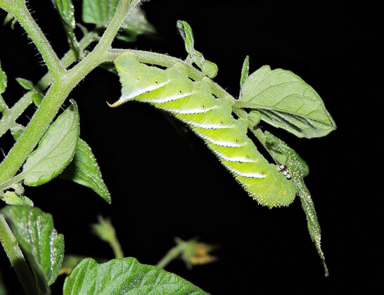 As they mature into the final and largest instar of their growth, signs of their huge appetites tattle on their presence. On tomato plants, stems devoid of leaves and large droppings known as frass (which act as fertilizer for the soil) can be seen quite easily. It’s actually quite startling to suddenly realize that this caterpillar has been on your plant for weeks, slowly eating and growing until it can no longer hide.