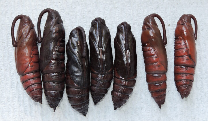 Within this subterranean environment, it forms a cozy little chamber around itself and begins its transformation. Within a few days, its sheds its skin one more time, revealing an astonishing, reddish-brown pupa.