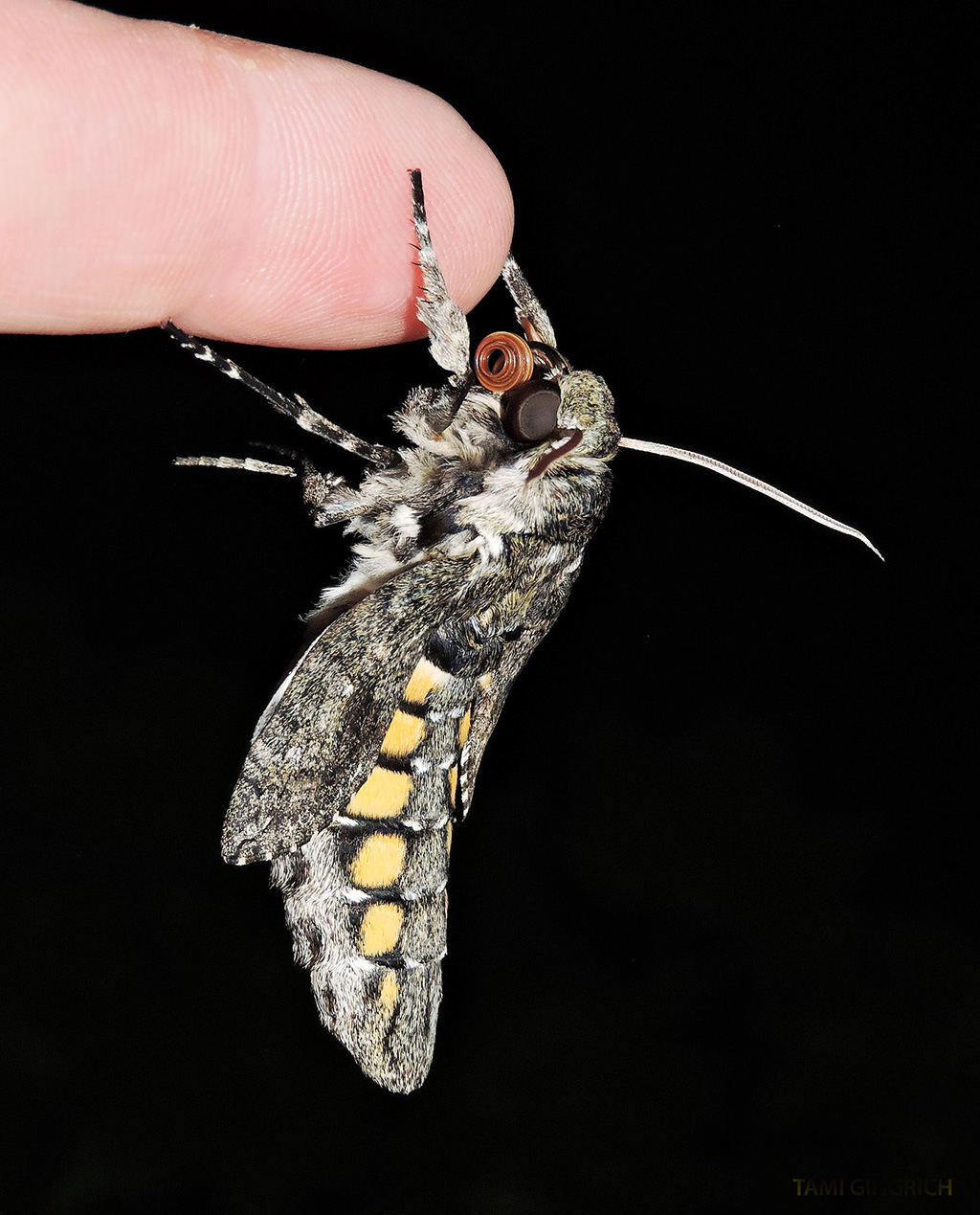 Unlike the giant silkmoths that arrive into adulthood with no mouthparts and only live around seven days, long enough to mate and lay eggs, the sphinx moths have a longer lifespan. With a super long tongue, or proboscis, the moths are able to sip nectar from long tubular blossoms which are unreachable by other insects.