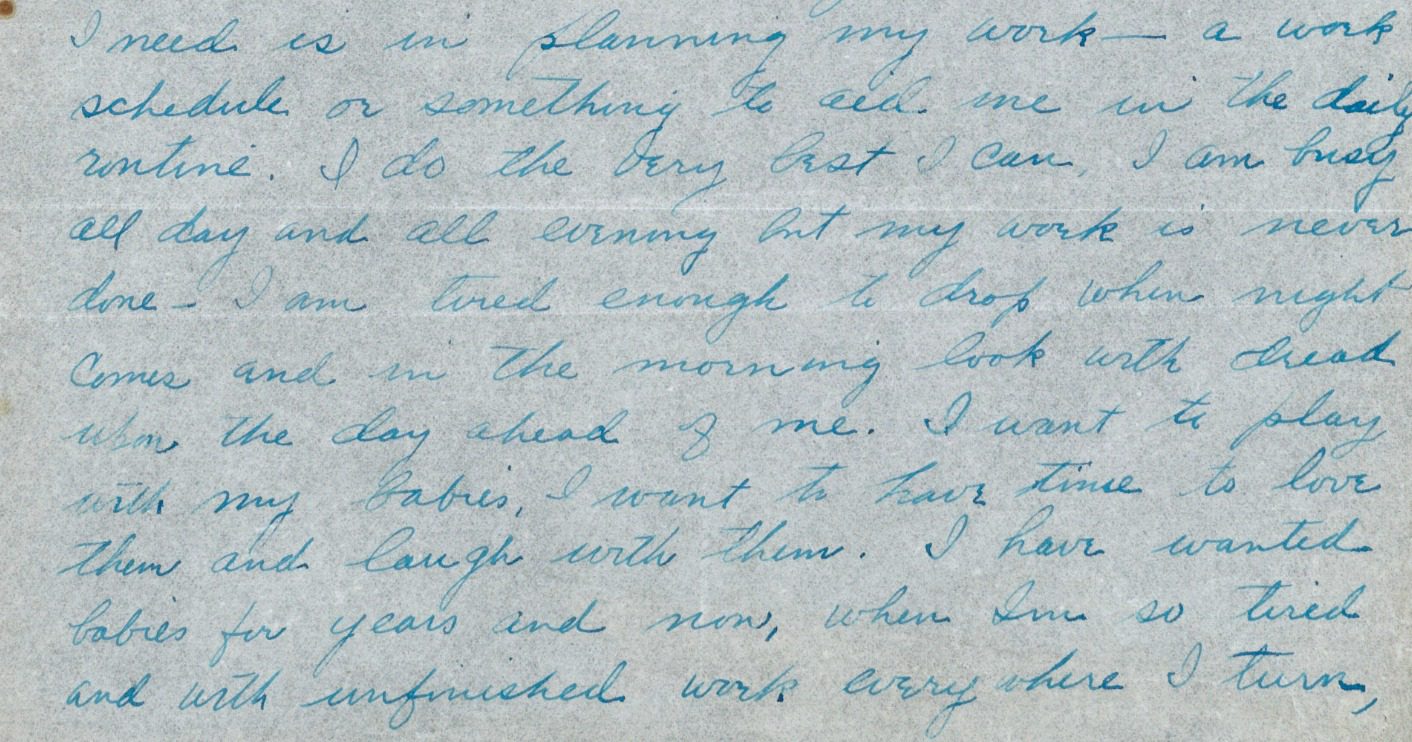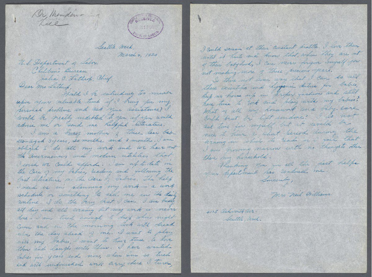 One featured letter, written in 1920 by Mrs. Neil Williams — the mother of three children under the age of four — asks Children’s Bureau Director Julia Lathrop how to manage “all these scientific and hygienic duties for babies,” keep up with housework, and love and nurture her children.