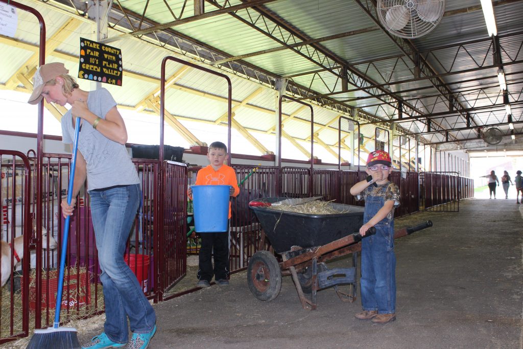 In the goat barn, Wyatt, 6, and Waylon, 4, help their mother, Sabrina Rittenhouse, sweep hay out of the aisle and load it into a wheelbarrow. Rittenhouse’s daughter, Sky, 17, will show in the Aug. 30 dairy goat show with her Nigerian Dwarf goats.