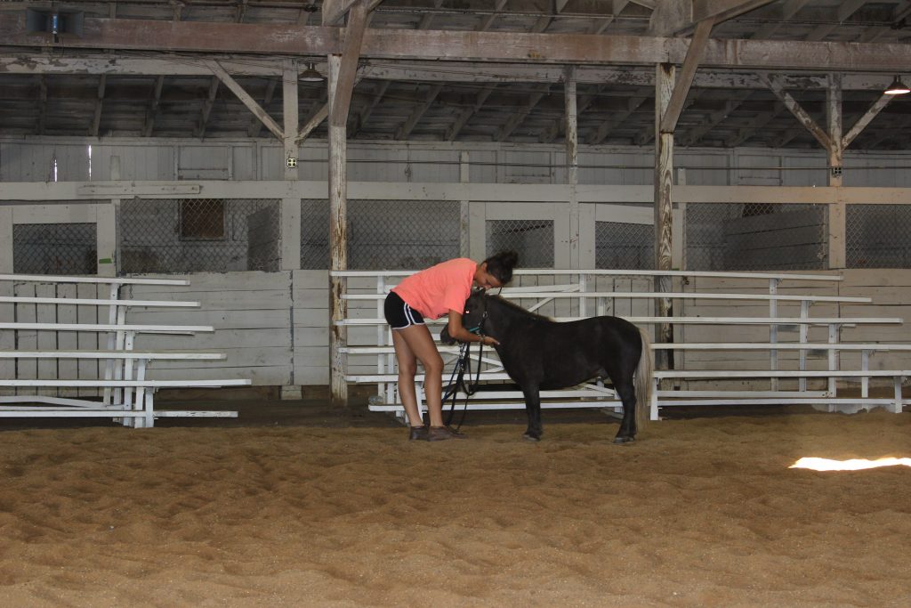 Sidney Hawk, 15, and her miniature horse, Peanut, walk around an indoor arena in the horse barn. They are preparing for their upcoming show.