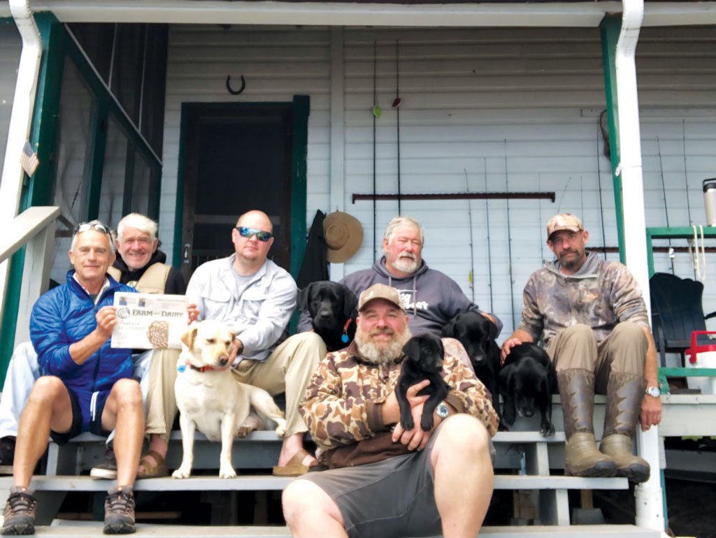 Johnny Lang, of Mogul Creek Farm, took his Farm and Dairy to visit Lake Moisseau, just outside of Waltham Quebec, Canada. Lang, who is studying to become a naturalist, was there as a student of the Black River Club, a remote fishing camp on lake Moisseau surrounded by 209,298.26 acres of boreal forest. The camp is only accessible by boat. Pictured from left to right are John Lang, Roy Lehman, Bella (white lab) Scott Borror, Zoey (black lab), Ivan Borror, Tom Borror, Lake (puppy), Brutis and Brooke, (black labs) and Adam Borror.