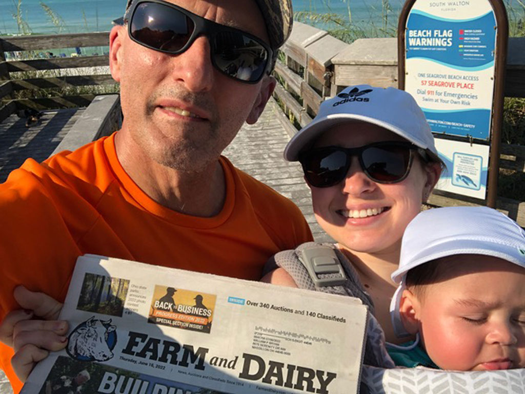 Six-month-old Patrick recently visited the panhandle of Florida for a beach vacation in Santa Rosa Beach, Florida. Pictured, along with a recent issue of Farm and Dairy, are grandpa Bill Bryan, who has a farm in Navarre, Ohio; mom Hillary Laughlin; and Patrick.