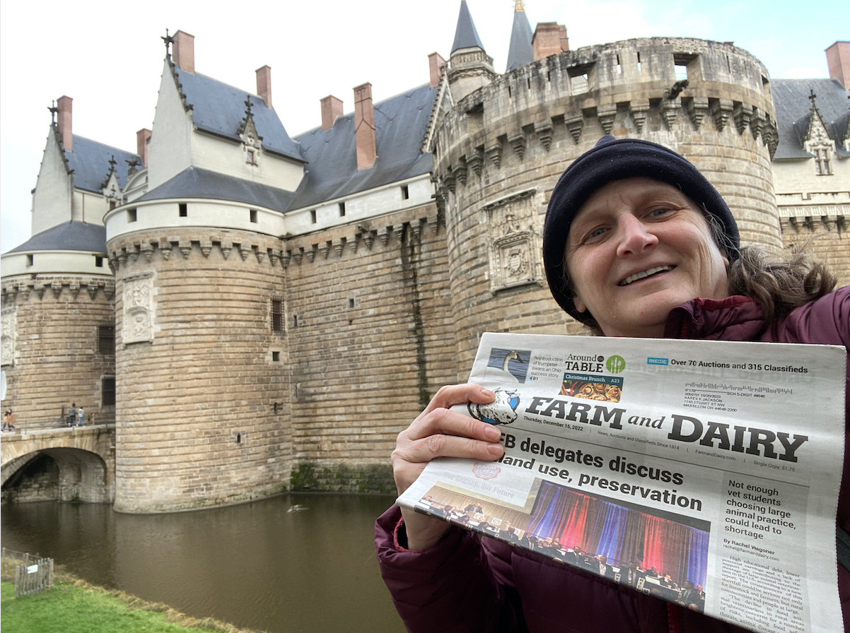 When Karen Jackson recently traveled to Nantes, France, over the 2022 Christmas holiday to visit her daughter, she had to take proper reading material — Farm and Dairy. She is shown in front of the Castle of the Brittany Dukes which dates to the early 1200s. (Submitted photo)