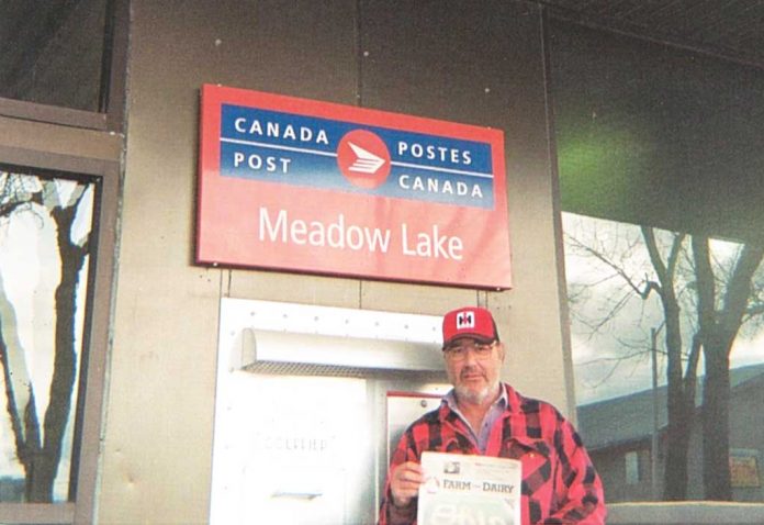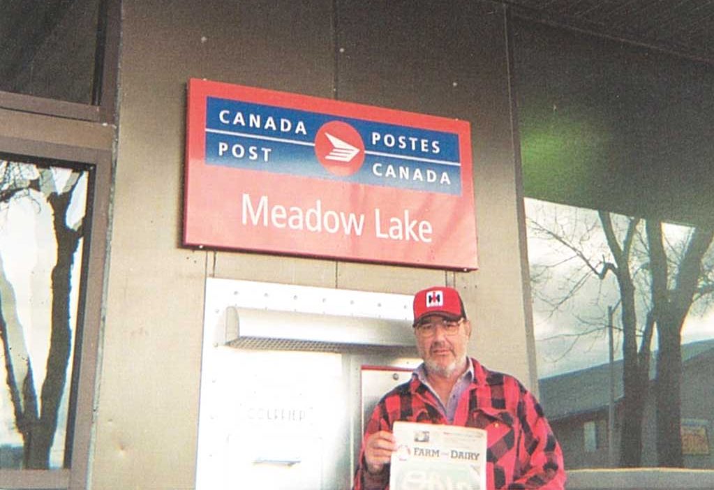 Stanley Miller, of Carrollton, Ohio, drove 32 long hours to Meadow Lake, Saskatchewan. Here he is with Farm and Dairy at the end of the road in Meadow Lake.