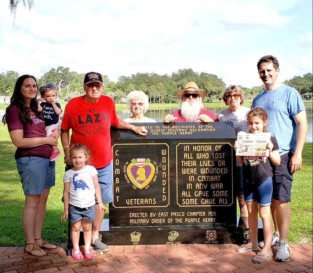 Farm and Dairy Copy Editor Aimee Tenzek, of Lisbon, Ohio, and her family visited Aimee’s grandparents in Zephyrhills, Florida, June 11-16. Pictured (left to right): Aimee, holding Juliette Tenzek; Elise Tenzek; Dick, Catherine and Mike Davis, of Zephyrhills; Vicki Carroll, of Minerva, Ohio; and Matt and Lillian Tenzek. The group is standing in front of the East Pasco County Purple Heart monument.