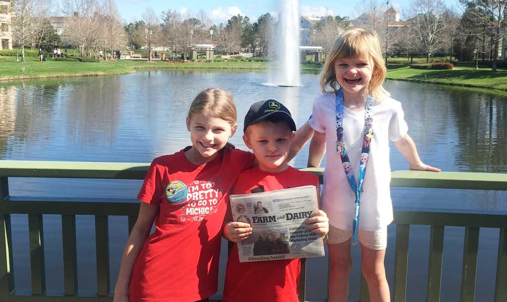 The Ujcich family of Bowerston, Ohio, took Farm and Dairy to Saratoga Springs, Walt Disney World. Pictured (left to right) are Kylie, Karter and Khloe. The trio vacationed along with their parents, Jimmy and Jessica.