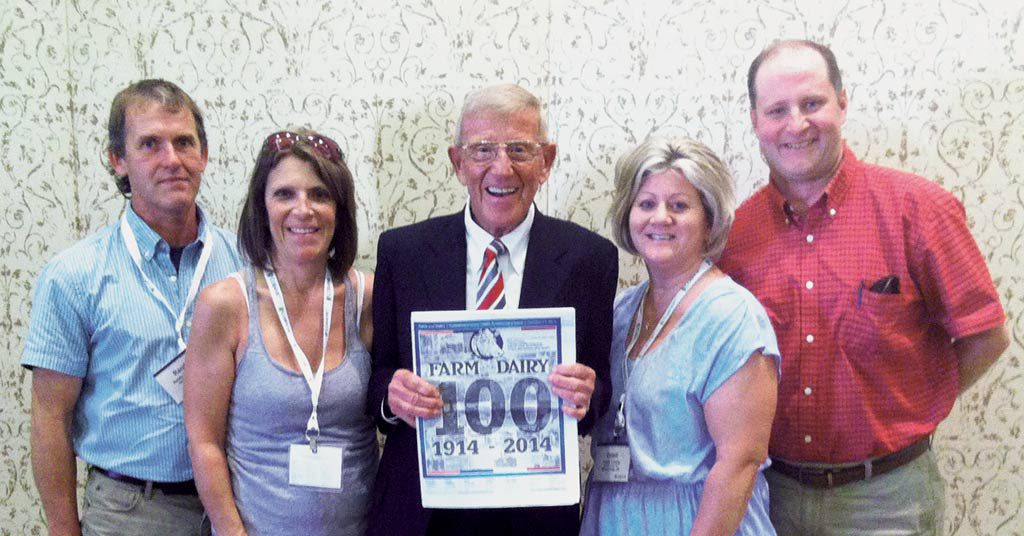 Randy and Karen Campbell, of Homeworth, Ohio; Lou Holtz, legendary college football coach and sportscaster; and Estell and Lamar Liming, of Lordstown, Ohio, were flipping through Farm and Dairy’s 100th Anniversary Issue while they vacationed at Terranea Resort in Rancho Palos Verdes, Calif., Nov. 4.