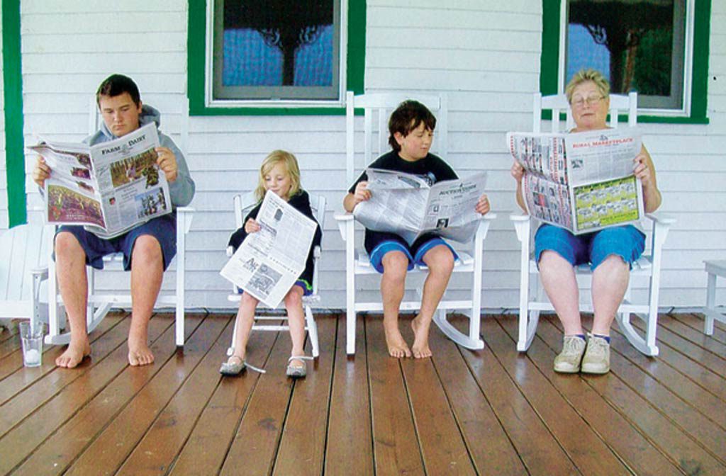 Breslin, Louisa and Niall Walker share the Farm and Dairy with their grandma, Loreta Fultz, of Youngstown, while sitting on the porch of the historic Balli Farm in Pickens, W.Va. July 30. The farm is set smack in the middle of the Holly Ricker State Park, this family farm is now a bed and breakfast.