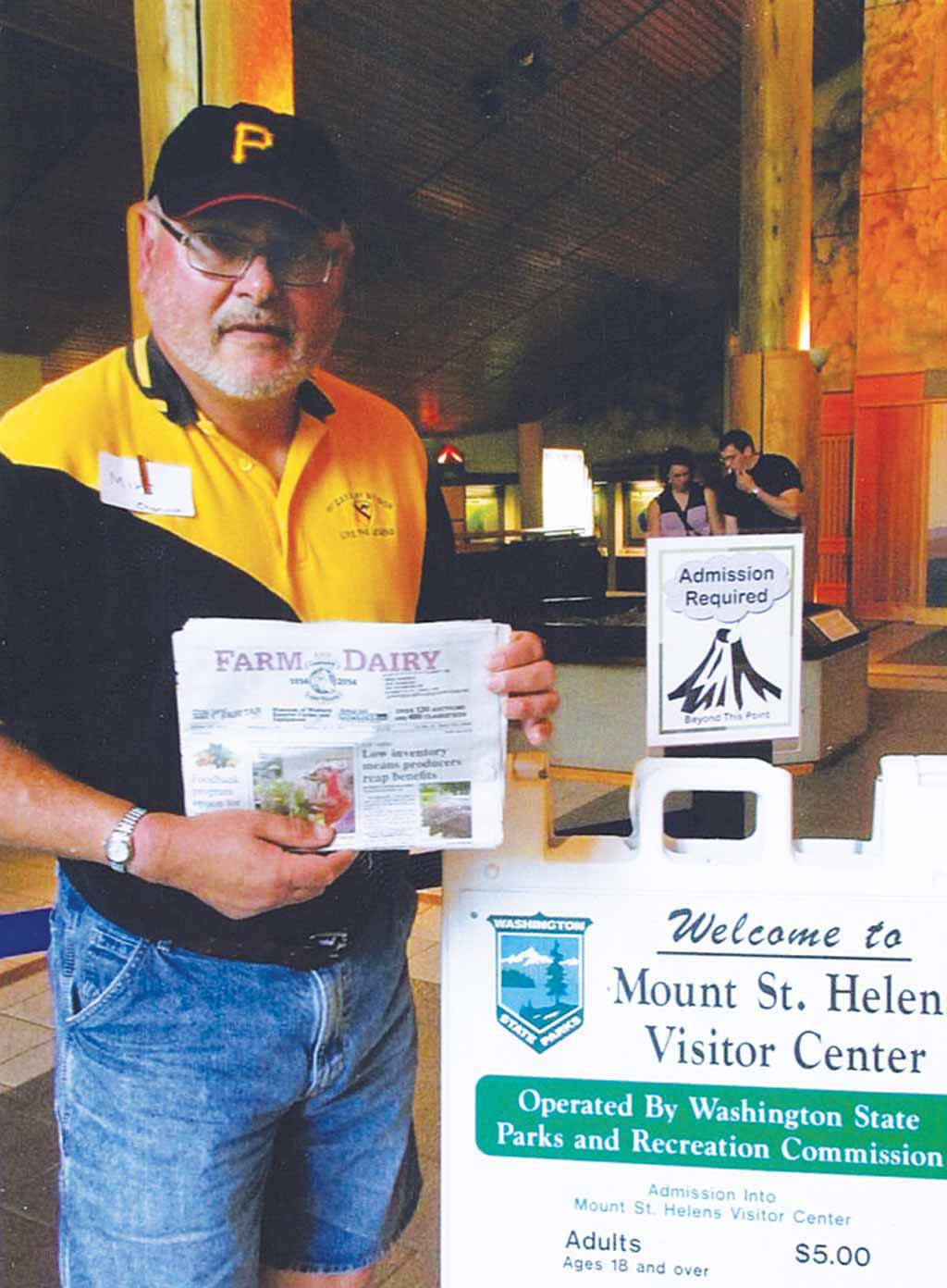 Mike Chanoski and his wife, Sue (on camera duty), of Harrison City, Pennsylvania, let us hitch a ride as they toured the West Coast from Seattle, Washington, to San Francisco, California, in August on a 40th wedding anniversary vacation. (Son Jon stayed home to feed and tend the cows.) They stopped at the Mount St. Helens Visitors Center for a visit and this photo. Here’s to many more years… and where are we going for your 50th?