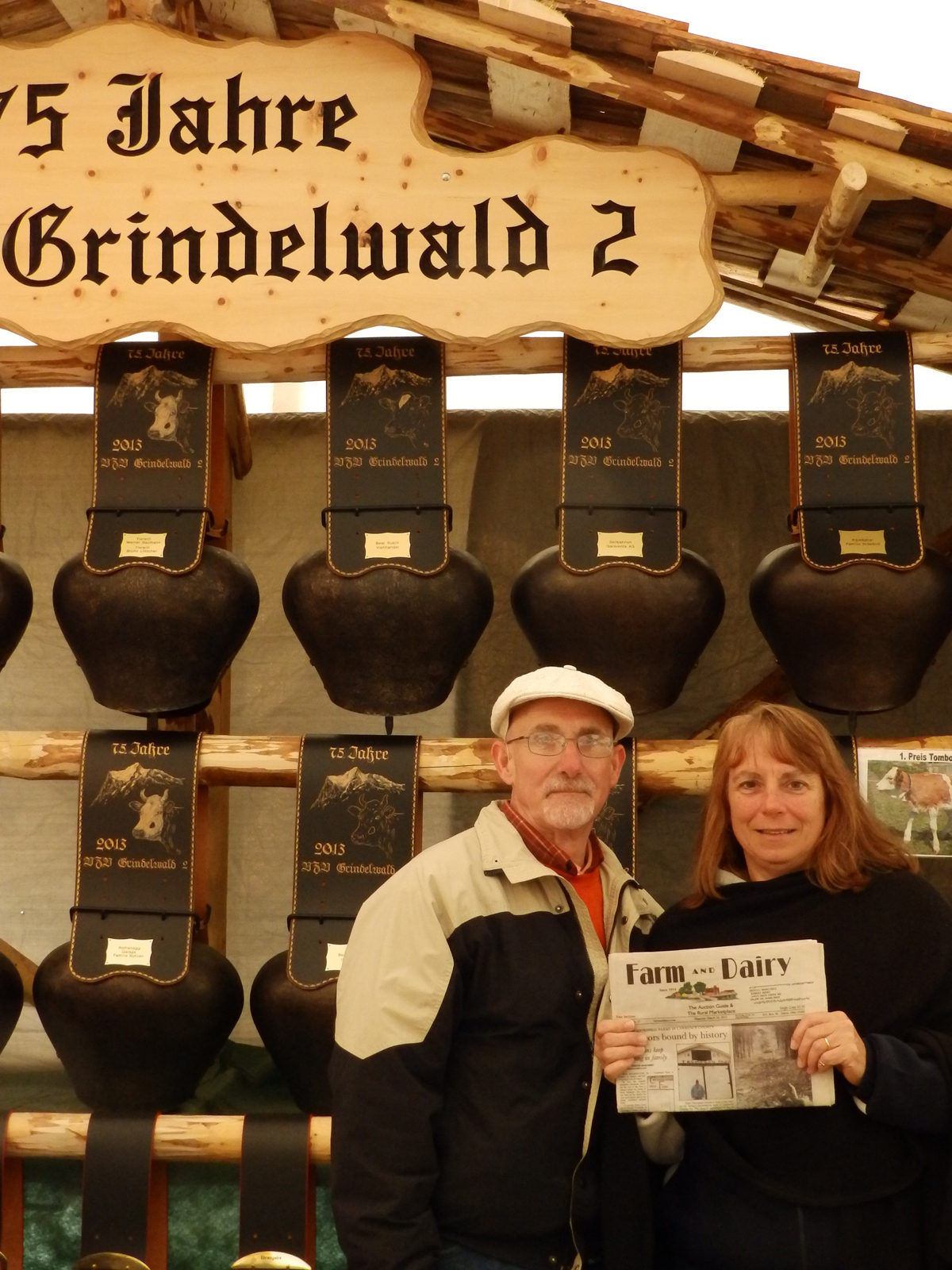 John and Barbara Biery, of North Benton, Ohio visited Grindelwald, Switzerland in the Eiger Mountains April 20. There was a cow show scheduled for the afternoon but was postponed because a foot of snow fell overnight and it was to dangerous for the cows to walk down into town. The cowbells behind us are the awards and are actually worn by the lead cows when the herds are moved to pasture.