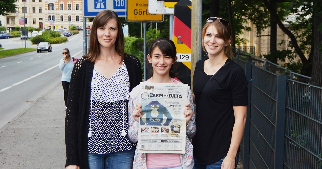 Jessica Hennon, Shiane Hennon and Larissa Conner, daughters and niece of John Papach Jr., of Enon Valley, Pennsylvania, visited the Hennon family who is stationed in Germany. Unable to take time away from his dairy farm, John Papach sent his Farm and Dairy to Europe with his daughters, who proudly represent for their dad.