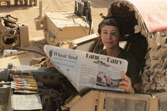 Suzanne Mulet, 2nd Lieutenant in the U.S. Marine Corps, relaxes with Farm and Dairy while on convoy in Helmand Providence, Afghanistan. Thank you for your service to our country Suzanne!