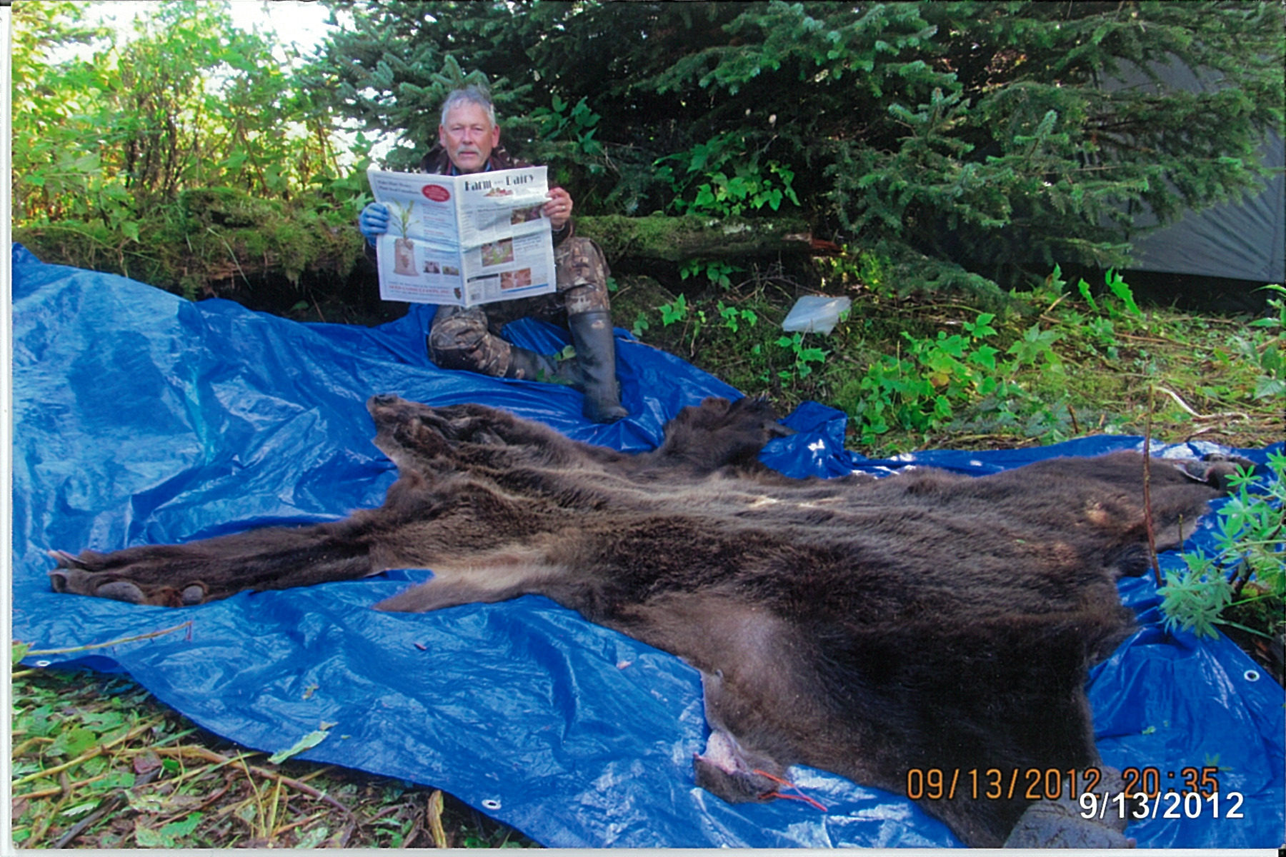 Bob Bergmeyer, of Canton, Ohio, takes a break to read Farm and Dairy while bear hunting in Cordova, Alaska. Bergmeyer spent his birthday in Alaska, hunting brown bear and moose. He got a bear his second day out, but while he was out hunting moose later, the bears ransacked his campsite. He still had a good time visiting with friends -- and he came home with a bear and about 50 pounds of halibut!