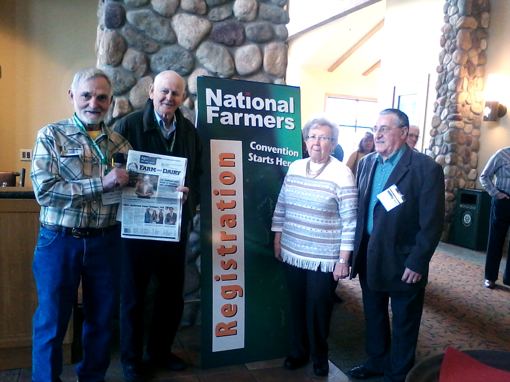 Washington County, Ohio, farmers read the Farm and Dairy at the Great Wolf Lodge in Cincinnati, while attending the National Farmers convention. From left to right: Robert Tornes, ClearVu Farm; Earl Schaad, Schaad Dairy; and Evelyn and Tom Strauss, Strauss Farm. (Submitted photo)